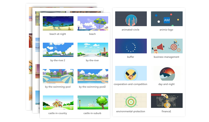 It is quite easy for every user to begin a video presentation work from online template, PPT file or a new empty project with Animiz animated video generator. Besides, in the process of editing and designing, you are allowed to simply apple the pre-made scenes to promote a high-quality animated video. There are a number of online stunning scene templates grouped into different categories, such as Animated Scene, Fantasy, Modern, Outdoor, Indoor and more. And you can choose any one of them to quickly generate an attractive work.